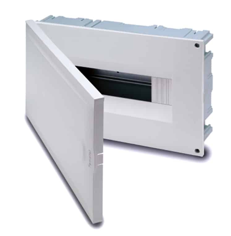 Armario metálico empotrable con capacidad para 12 módulos DIN, fabricado por Famatel. Ideal para instalaciones eléctricas residenciales o comerciales pequeñas que requieren una solución ordenada y segura para alojar dispositivos de protección y control eléctrico.