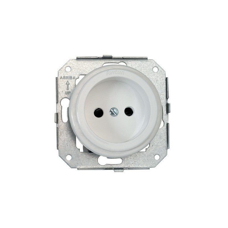 Esta base de enchufe fabricada en porcelana no incluye toma de tierra (TT), por lo que no se trata de un enchufe Schuko estándar. Su principal diferencia con los enchufes convencionales es la ausencia de la tercera clavija de conexión a tierra, lo que la hace adecuada únicamente para instalaciones eléctricas donde la conexión a tierra no es necesaria o no está disponible.